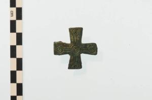 Fibula a croce greca in bronzo con tracce di argentatura. Mancante dell'ardiglione.
