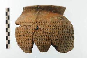 Olla ad orlo estroflesso, breve gola, corpo globulare e fondo piano. Corpo interamente decorato, a esclusione dell'orlo e della gola, con motivi impressi su più registri.