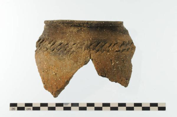 Olla ad orlo estroflesso a bordo arrotondato e corpo espanso. Sulla spalla decorazione costituita da due file parallele orizzontali di tacche impresse oblique. Sul ventre motivo a tacche allungate irregolari 'a tappeto'. Ceramica grossolana.
