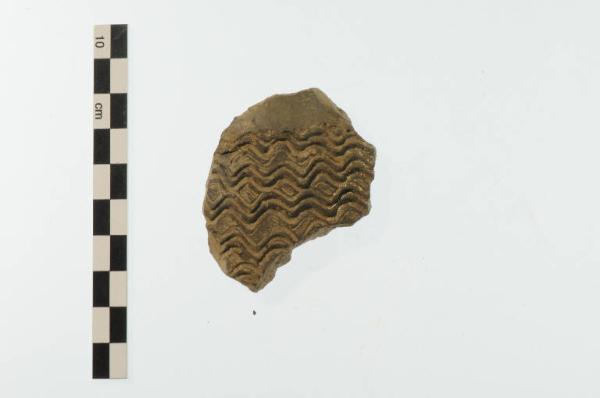 Frammento di parete di bottiglia (?). Superficie esclusa dalla decorazione accuratamente lucidata.