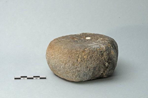 Piccola macina in pietra di forma discoidale.