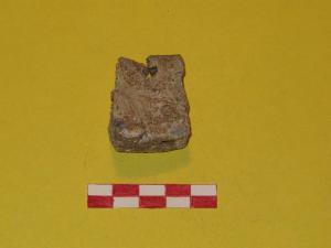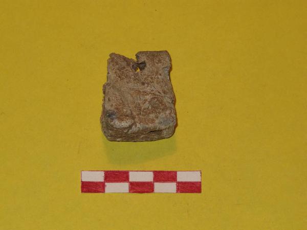 Piccolo peso troncopiramidale in piombo, con foro di sospensione passante all'estremità più stretta.