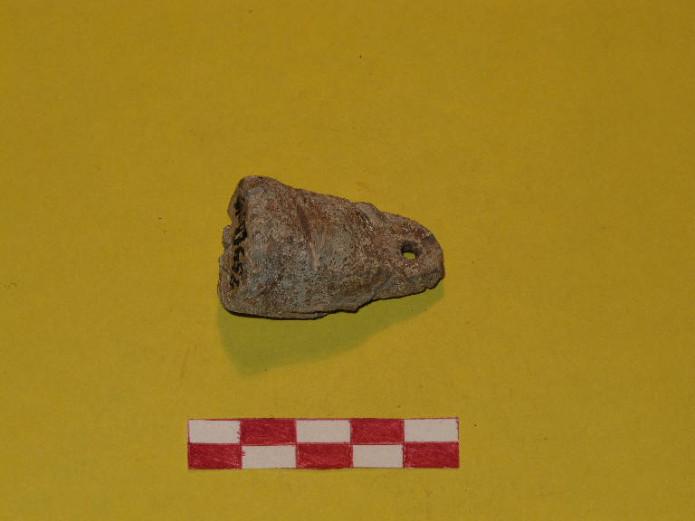 Piccolo peso troncoconico in piombo, con foro di sospensione passante all'estremità superiore.