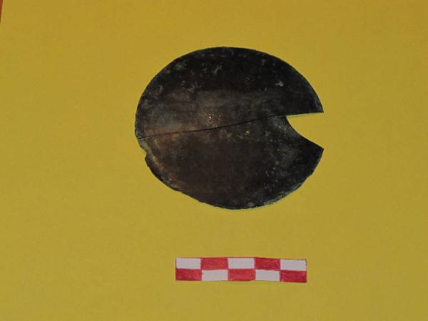 Specchio di forma circolare, in sottile lastra di bronzo. Superficie riflettente accuratamente levigata. Parzialmente ricomposto da quattro frammenti.