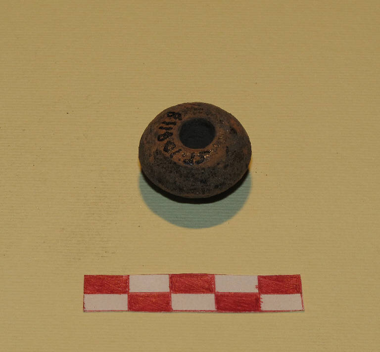 Esemplare di fuseruola bitroncoconica invetriata. Corpo ceramico depurato di colore bruno arancio, vetrina coprente verde oliva. Diam. max cm 2,6; alt. cm 1,4. Datazione: VII-VII secolo d.C. Provenienza: Acquafredda, cascina scuola.
