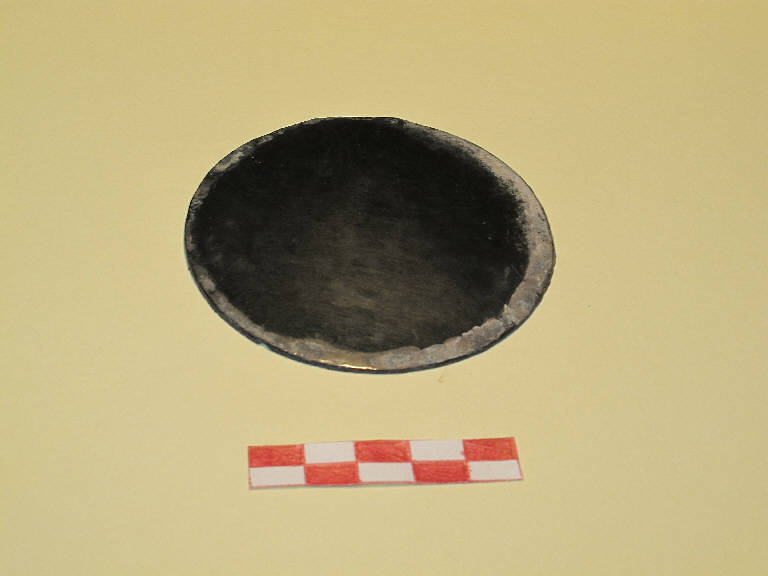 Specchio circolare, privo del manico. Disco frammentario, con superficie riflettente leggermente convessa. Incrostato.