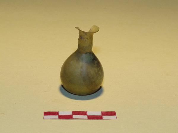 Balsamario in vetro a corpo globulare di tipo Isings 6. Colore giallo, trasparente.