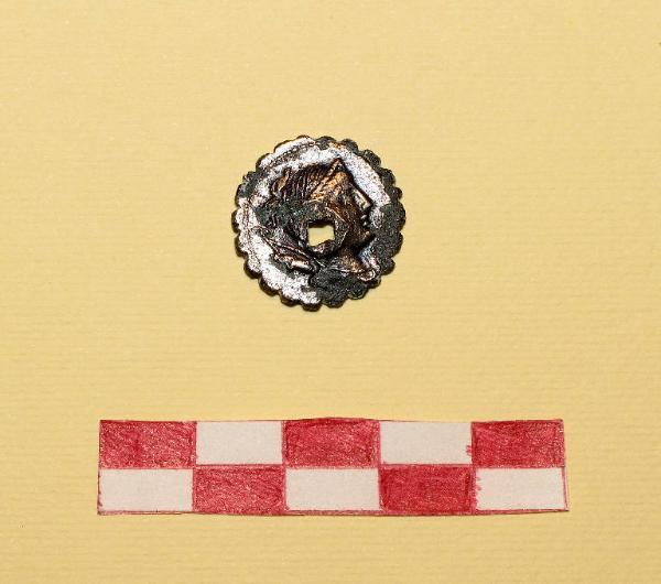Denario suberato, dentellato, in bronzo argentato. Età repubblicana.\nD/ testa di Venere.\nR/ illeggibile\nForo quadrangolare (mm 3 x 3)