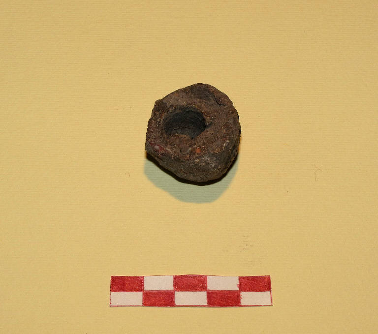 Peso in piombo di forma discoidale, con incavo nel mezzo.
