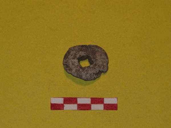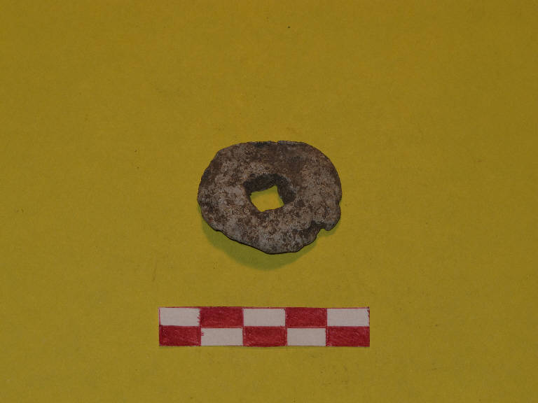 Peso in piombo di forma sub circolare piana, con foro quadrato passante.