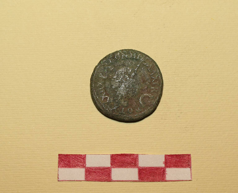 Moneta romana in bronzo, fortemente usurata e illeggibile