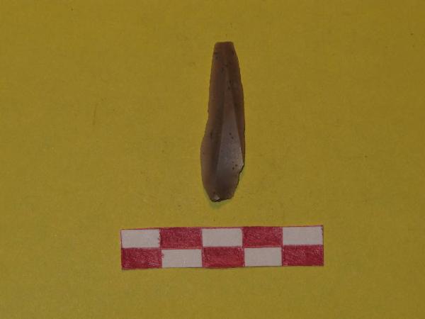 Lamella in selce di colore beige, a sezione triangolare-trapezoidale. Integro.