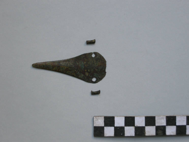 Pugnale a lama triangolare piatta, con tallone espanso e leggera costolatura mediana. Di forma foliata, nella parte della base è provvisto di due piccoli fori tondi destinati a fissarlo all'immanicatura.