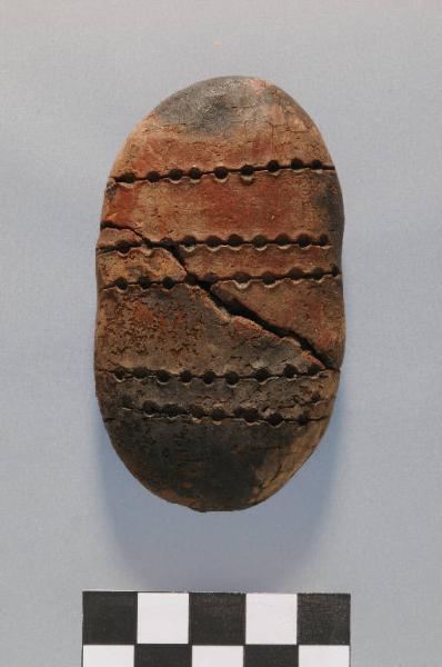 Tavoletta enigmatica di forma ellissoidale con linee orizzontali incise su cui si dispongolo impressioni circolari.