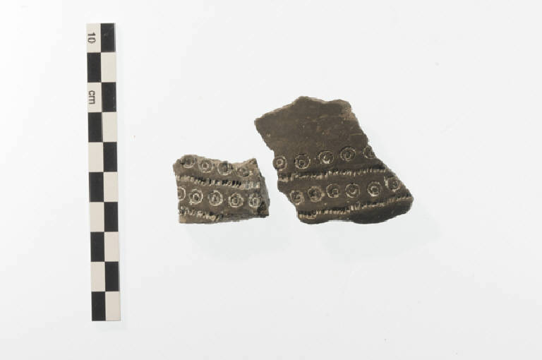 2 frammenti di parete pertinenti a recipiente, prodotto in ceramica d'impasto grossolana e superfici lisciate. Presenta una decorazione costituita da cerchietti concentrici e file di piccole linee incise.