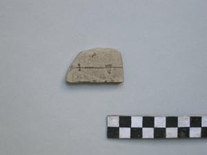 Ciottolo calcareo di forma trapezoidale, a facce piane e di colore bianco. Presenta su una delle due facce, nel punto mediano, una riga incisa ben marcata che lo attraversa orizzontalmente per tutta lunghezza.\nSu questa riga si notano a sinistra, 3 coppelle emisferiche disposte ortogonalmente alla riga incisa< dopo di esse una serie di otto trattini verticali raggruppati< all`estrema destra del ciottolo un piccolo triangolo con la punta rivolta verso il basso, posto in posizione mediana alla riga.\nAlla base del ciottolo, in corrispondenza della linea di frattura, si intravedono altri segni che non [ possibile decifrare.