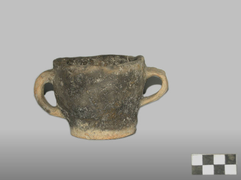 Tazza bi-ansata di forma irregolare, prodotta con ceramica d'impasto granulosa, con fiammate che vanno dal nero all'ocra al bruno, avente base piana e profilo troncoconico. Presenta due anse contrapposte, a circa metà altezza del corpo, una delle quali è "a orecchietta", l'altra ad anello allungato.