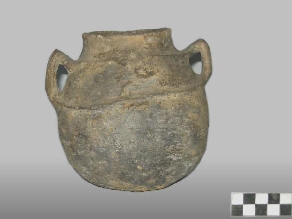 Anfora bi-ansata con corpo globoso, di forma irregolare e base convessa, prodotta con ceramica d'impasto brunastro, con superfici scabre e poco ingubbiate. Presenta gola leggermente scanalata, orlo liscio e leggermente espanso. Sulla spalla, si espandono due cordoni plastici come a formare la base delle due anse contrapposte, del tipo "a orecchietta rialzata", con spigolo superiore molto acuto. Nel punto mediano del cordone plastico superiore si nota un tubercolo plastico di forma conica, ottenuto dallo spessore del cordone stesso.