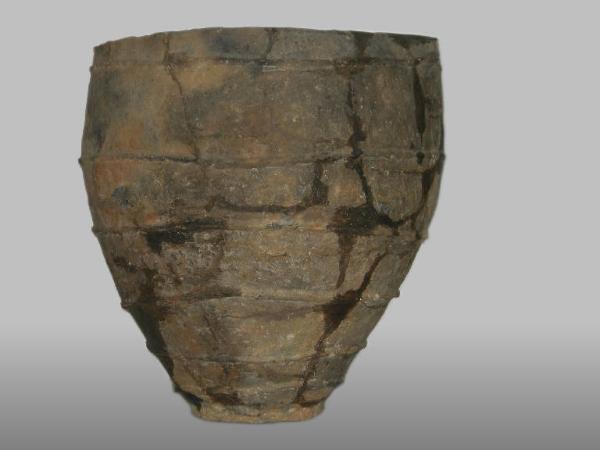 60 frammenti, prodotti in ceramica d'impasto color bruno, con molto degrassante, e fiammate di colore lungo il corpo, pertinenti a grosso dolio, di forma panciuta, base piatta e orlo liscio e diritto. Il corpo è decorato da 6 cordonature plastiche ad andamento irregolare che, partendo dalla bocca verso la base si trovano ad una distanza sempre più ravvicinata. Il cordone sottostante l'orlo presenta 4 prese a linguetta orizzontale, contrapposte tra di loro.