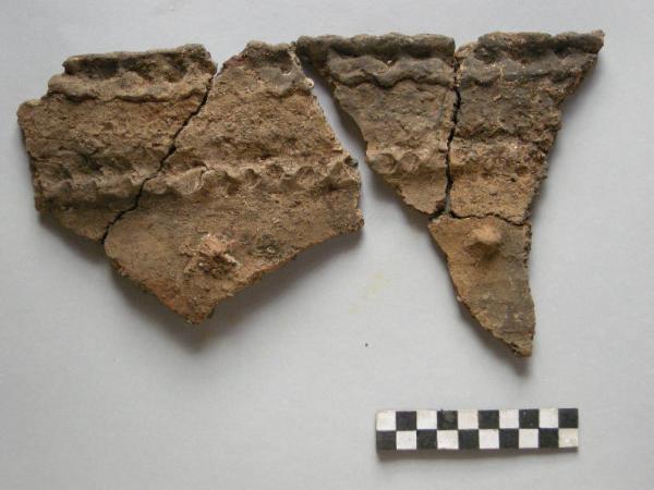 2 frammenti, prodotti in ceramica d'impasto grossolana, non molto depurata e con molti inclusi, pertinenti a grosso dolio, probabilmente di forma tronco-conica, avente l'orlo con impressioni a ditate. Sotto l'orlo, a circa 2 cm si notano 2 cordoni plastici applicati, distanti tra loro cm 5 circa, modellati "a pizzicato". E' possibile notare, ancora, sulla superficie, tracce di una bugna plastica molto corrosa.