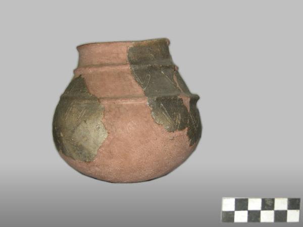 Boccale a corpo piriforme orlo arrotondato, prodotto in ceramica d'impasto grigio scura, grossolanamente depurata con inclusi litici e micacei, avente profilo sinuoso, fondo irregolarmente convesso. La decorazione è costituita da 2 cordoni plastici irregolarmente orizzontali e due file di linee incise foormanti un motivo a W alternati.
