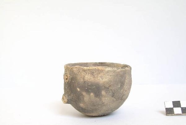 Ciotola emisferica mono-ansata, prodotta con ceramica d'impasto fine color grigio, con pochi inclusi. Si notano gli attacchi di un ansa.
