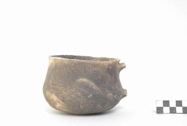 Tazza carenata mono-ansata, prodotto con ceramica d'impasto fine, color grigio, finemente ingubbiata, e fondo piano con al centro un incavo che nella parte interna del fondo del vaso da origine ad una bugna. Sotto l'orlo nella parte mediana del corpo del vaso si notano gli attacchi dell'ansa.