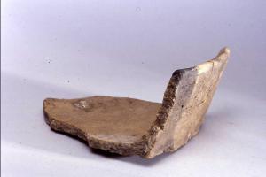 Frammento di orlo e paret, pertinenti a bacile a corpo carenato, prodotto con ceramica d'impasto mediamente depurata con inclusi litici e micacei, con orlo arrotondato, parete distinta, rettilinea e lievemente svasata verso l'orlo, vasca fortemente inclinata a lati rettilinei lievemente convessi e fondo piatto.