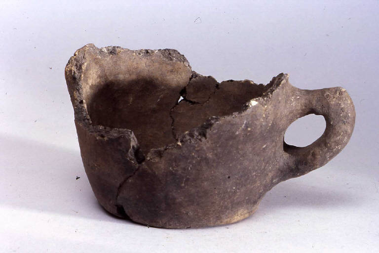 Tazza a corpo tronco-conico monoansata, prodotto con ceramica d'impasto finemente depurata e superficie lisciata e lucidata, con orlo piatto, imboccatura ovale, lati rettilinei, tacco pronunciato di forma arrotondata e fondo piano. L'ansa, di tipo a gomito, è impostata sotto l'orlo e alla base.