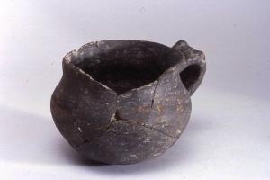 Tazza a corpo emisferico con risega monoansata, prodotta con ceramica d'impasto finemente depurata e superficie lisciata e lucidata, colror grigio scuro, con orlo di forma arrotondata, assottigliato, lievemente esoverso, parete distinta rettilinea rastremata verso l'orlo, fondo convesso. L'ansa, di tipo a orecchio, è impostata sotto l'orlo e presenta due piccole protuberanze irregolarmente coniche sulle estremità dell'apice.