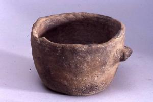 Tazza a corpo tronco-conico monoansata, prodotto con ceramica d'impasto grossolana e superficie lisciata, color marrone, avente orlo piatto, lati lievemente convessi, fondo piano. L'ansa, di tipo a presa, è impostata poco distante dall'orlo.