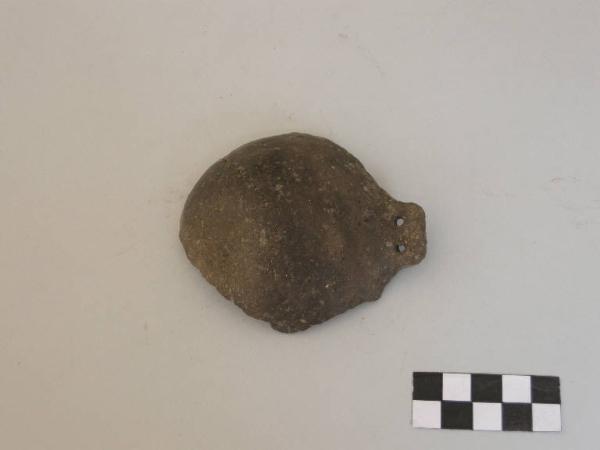 Ciotolina con corpo a calotta monoansata,prodotta con ceramica d'impasto finemente depurata con minuti inclusi micacei, color grigio scuro, e superficie lisciata, avente orlo arrotondato e fondo piano. Presenta una presa a linguetta rettangolare impostata sull'orlo con doppia perforazione verticale.