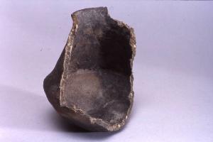 Tazza a corpo globoso-piriforme con risega,prodotto con ceramica d'impasto mediamente depurata con inclusi litici e micacei, color grigio scuro, e superficie lisciata, avente orlo di forma arrotondata, assottigliato e lievemente esoverso, parete distinta rettilinea rastremata verso l'orlo, vasca a calotta e fondo convesso.