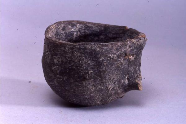 Tazzina a corpo globoso monoansata, prodotta con ceramica d'impasto mediamente depurata con inclusi litici e micacei, color grigio, avente orlo arrotondato, profilo emisferico e fondo piano. Si notano ancora gli attacchi di un ansa che si innestava sull'orlo.