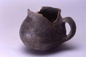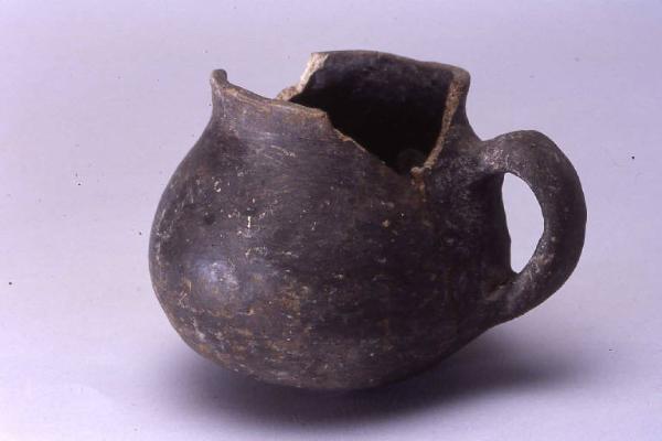 Boccale a corpo ovoide, prodotto con ceramica d'impasto finemente depurata, color grigio, e superficie lisciata, avente orlo arrotondato, assottigliato, lievemente esoverso, profilo sinuoso e fondo probabilmente convesso. L'ansa, di tipo ad orecchio.