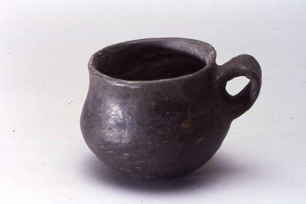Boccale a corpo ovoide, prodotto con ceramica d'impasto finemente depurata, color grigio, e superficie lisciata e levigata, avente orlo arrotondato, lievemente esoverso, profilo sinuoso e fondo convesso. L'ansa, di tipo ad orecchio.