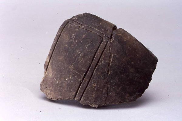 Frammento di scodella con corpo a calotta, prodotta con ceramica d'impasto mediamente depurata con inclusi litici e micacei, color grigio-bruno, e superficie lisciata, avente orlo arrotondato. presenta una decorazione incisa costituita da un rettangolo incorniciato.