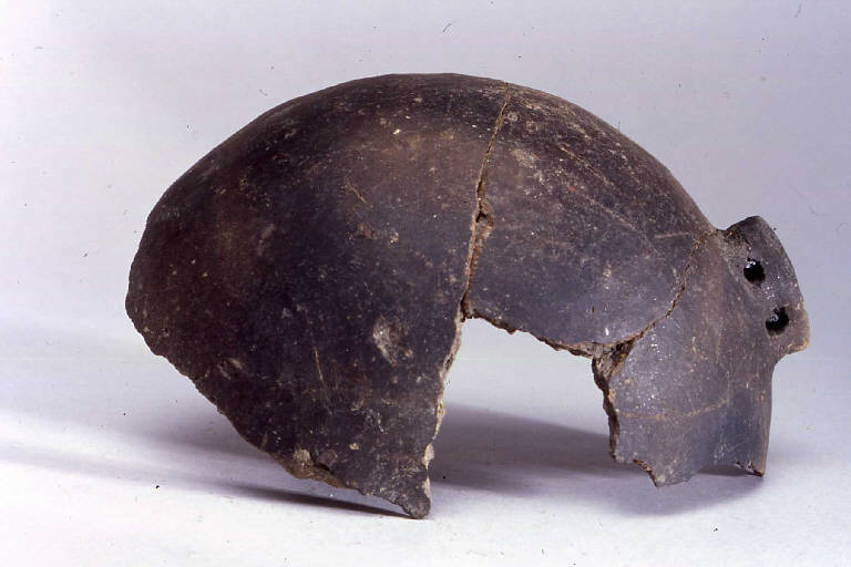 3 frammenti di scodella con corpo a calotta, prodotta con ceramica d'impasto mediamente depurata con inclusi litici e micacei, color marrone-grigio scuro, e superficie lisciata e lucidata, avente orlo arrotondato e fondo ombelicato. Presenta una presa a linguetta rettangolare con doppia perforazione verticale. Se ne conserva circa la metà.