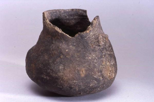 Boccale a corpo piriforme, prodotto con ceramica d'impasto grossolanamente depurata con inclusi litici e micacei (mica gialla e grigia), color grigio molto scuro, avente orlo arrotondato lievemente esoverso, profilo sinuoso e fondo convesso.