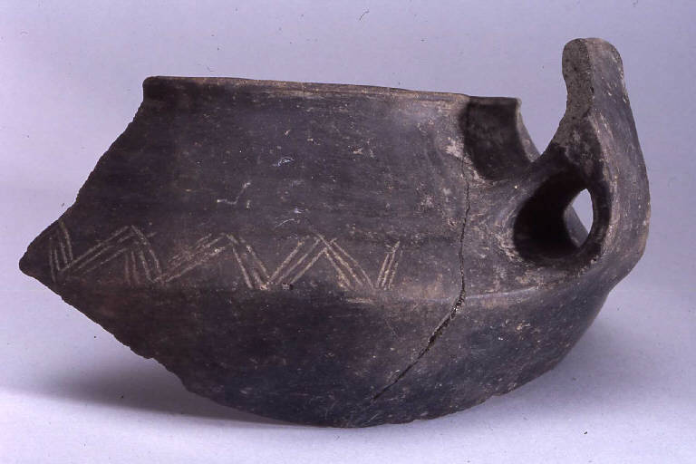 2 frammenti di capeduncola a corpo biconico, prodotta con ceramica d'impasto finemente depurata con minuti inclusi micacei, color grigio, e superficie lisciata e lucidata, avente orlo arrotondato, assottigliato, parete distinta lievemente concava e vasca a calotta. L'ansa è di tipo ad ascia. Presenta due diverse decorazioni; la prima, si trova sulla parete distinta ed è cotituita da 3 solcature orizzontali e parallele, due delle quali formano, nei pressi dell'ansa un motivo angolare; la seconda, subito sopra la carena, presenta un motivo costituito da due denti di lupo riempiti a tratteggio e un motivo a zig-zag.