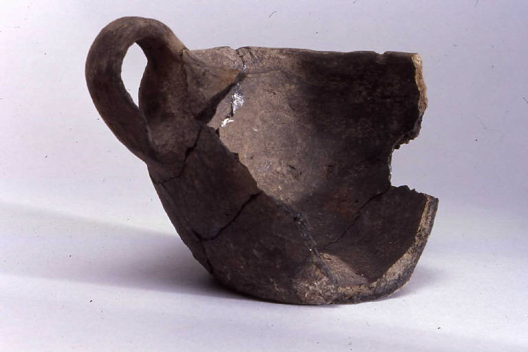 Tazza carenata, monoansata, prodotta con ceramica d'impasto finemente depurata con minuti inclusi micacei, color grigio, avente orlo arrotondato, parete distinta rettilinea e vasca tronco-conica con le pareti oblique e fondo piano. L'ansa, del tipo nastriforme ad anello, è impostata all'orlo.