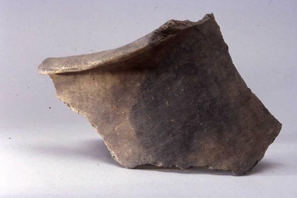 Frammento di orlo e parete, pertinente ad anfora, prodotta con ceramica d'impasto mediamente depurata con inclusi litici e micacei, color grigio, avente orlo a tesa, esoverso.