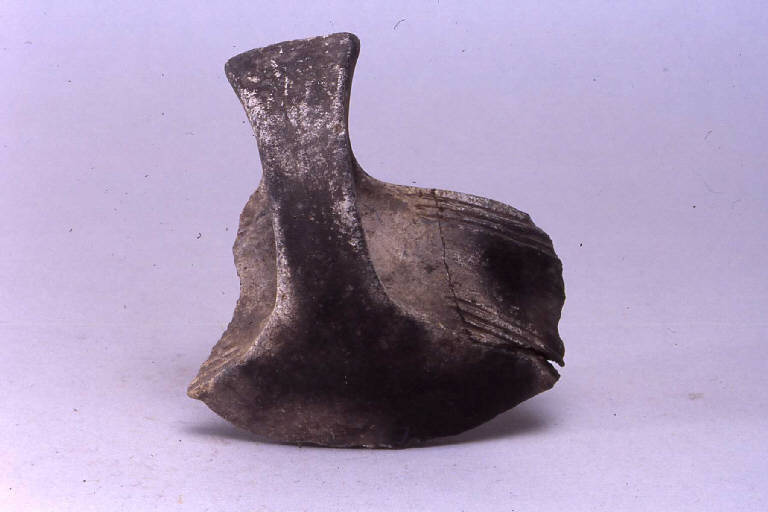 Frammento di orlo e parete con ansa, pertinente a capeduncola, prodotta con ceramica d'impasto finemente depurata con minuti inclusi micacei, color grigio chiaro, e superficie lisciata, avente orlo piatto, parete distinta lievemente convessa e vasca a calotta. L'ansa è del tipo ad ascia.