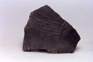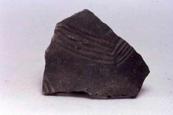 Frammento di parete, prodotto con ceramica d'impasto finemente depurata con minuti inclusi micacei, color grigio scuro, e superficie lisciata, su cui è inciso un motivo decorativo a fasce di solchi paralleli che si incontrano a formare un angolo.