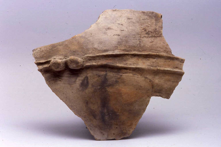 Frammento di parete con ansa, pertinente ad anfora, prodotta con ceramica d'impasto mediamente depurata con inclusi litici e micacei, color marrone pallido. Ansa a presa a doppio bottone. Presenta come decorazione due cordoni plastici longitudinali, su cui è innestata l'ansa.