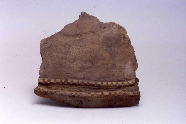 Frammento di parete, pertinente a vaso, prodotto con ceramica d'impasto mediamente depurata con inclusi litici e micacei, color grigio. Presenta un motivo decorativo costituito da due cordoni plastici paralleli sui quali sono incise delle punzonature.