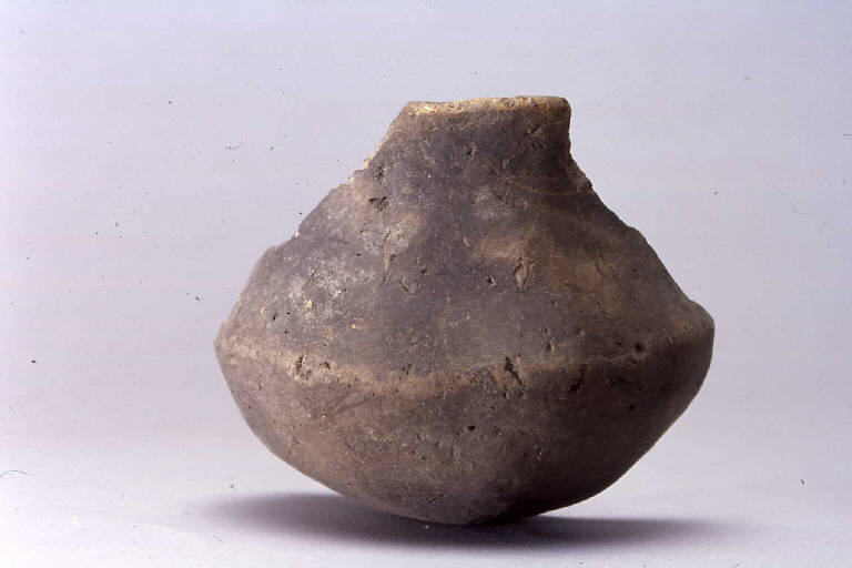 Boccaletto a corpo carenato, prodotto con ceramica d'impasto mediamente depurata con inclusi litici e micacei, color grigio, avente orlo arrotondato, esoverso, parete distinta lievemente convessa e fondo convesso.