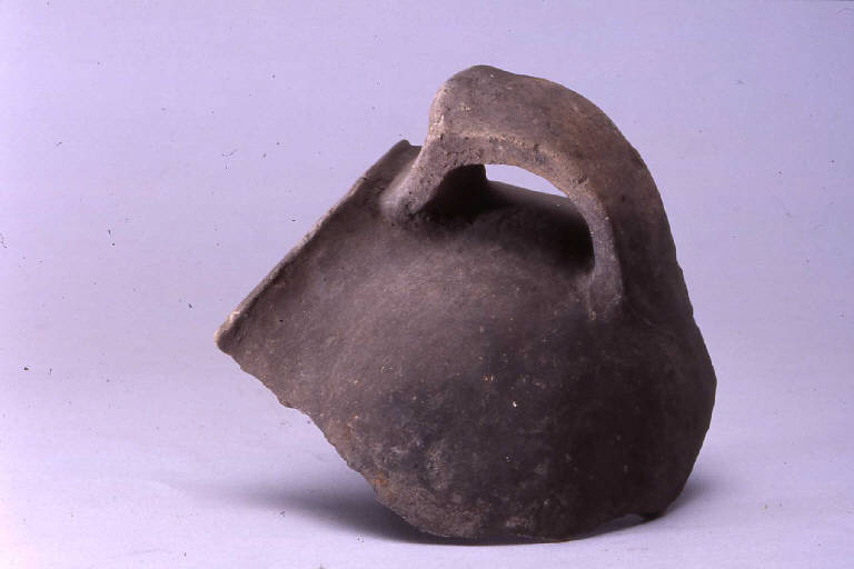 Boccale a corpo globoso, prodotto con ceramica d'impasto mediamente depurata con inclusi litici e micacei, color grigio-marrone, e superficie lisciata, avente orlo arrotondato, assottigliato, lievemente esoverso e profilo sinuoso. L'ansa nastriforme è impostata sotto l'orlo.