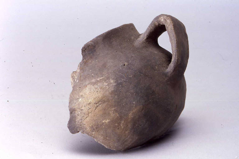 Tazza con corpo a calotta, prodotta con ceramica d'impasto finemente depurata con minuti inclusi micacei, color grigio-marrone, avente orlo arrotondato, esoverso, e profilo sinuoso. L'ansa, è di tipo a gomito.