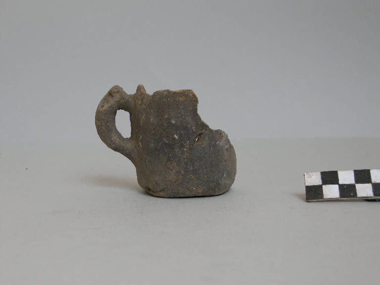 Tazza a corpo tronco-conico, prodotta con ceramica d'impasto mediamente depurata con inclusi litici e micacei, color grigio, avente orlo arrotondato, parete rettilinea irregolare e fondo piano. L'ansa è a gomito.